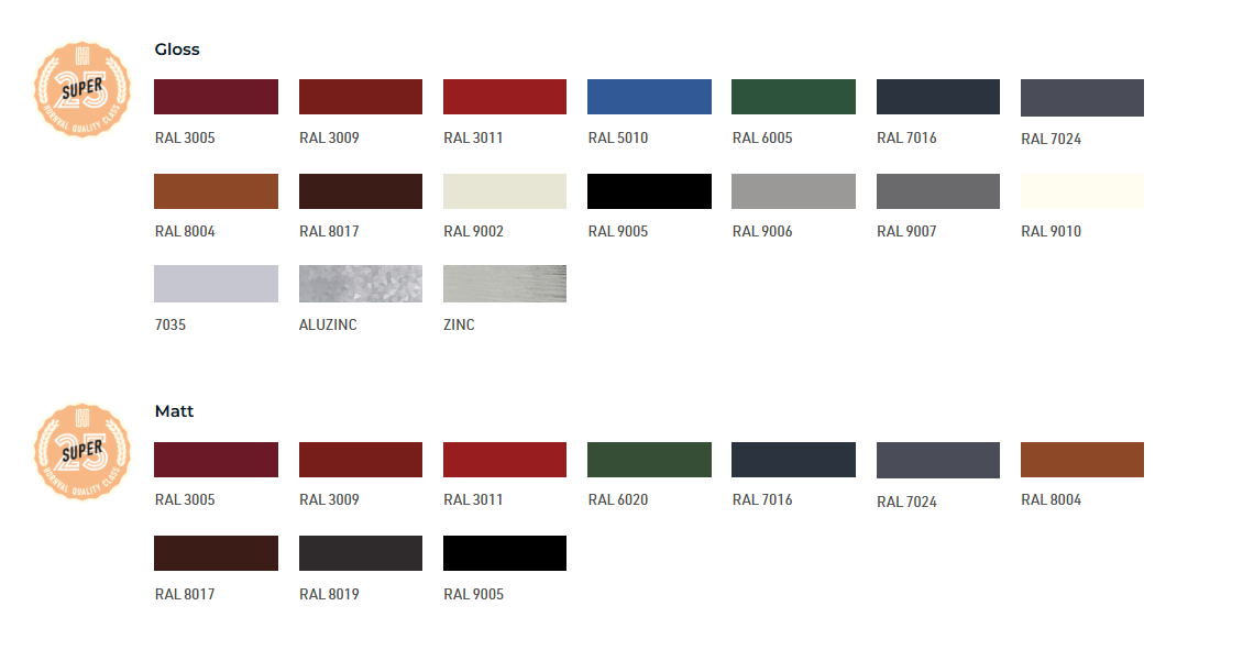 SVARĪGI! Lūdzu, ņemiet vērā, ka dažādu tērauda izstrādājumu (kā dakstiņu profilu, trapecveida profilu, skārda locījumu u.c.) nokrāsas, kaut arī apzīmētas ar to pašu RAL kodu, var nedaudz atšķirties. Īpaši, ja izstrādājumi ir no dažādiem ražotājiem.